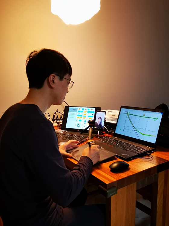 《机器人创意设计与实践》是刘涛老师开设的全校公共选修课程,选课人数120人。为了适应疫情期间的在线授课需求,课程在课堂设计、交互方式上都进行了研究。刘涛老师在课前进行了多次不同规模的测试和演练。为了确保上课有效性,采用了笔记本,手机,手写板,外扩屏幕等工具,搭建了丰富灵活的授课平台,同时利用家用网络和手机网络,增强了网路可靠。在课程中使用了“雨课堂+腾讯会议+腾讯QQ”平台多种形式结合协同的方式,既保证了课堂基本信息的采集,又能提供高质量的音视频传输,及时与同学们进行课堂互动。尽量规避网络授课短板,利用好网络授课的优势,讲好每一课。