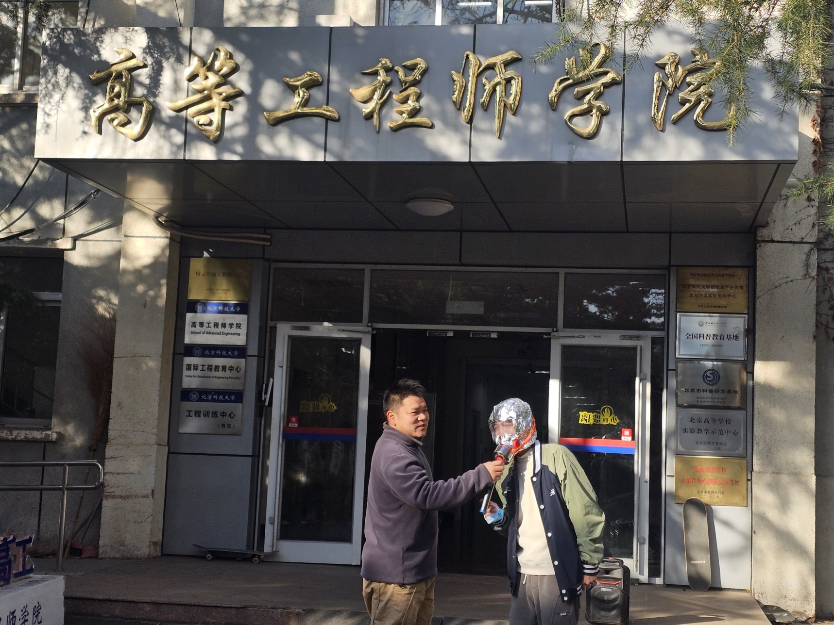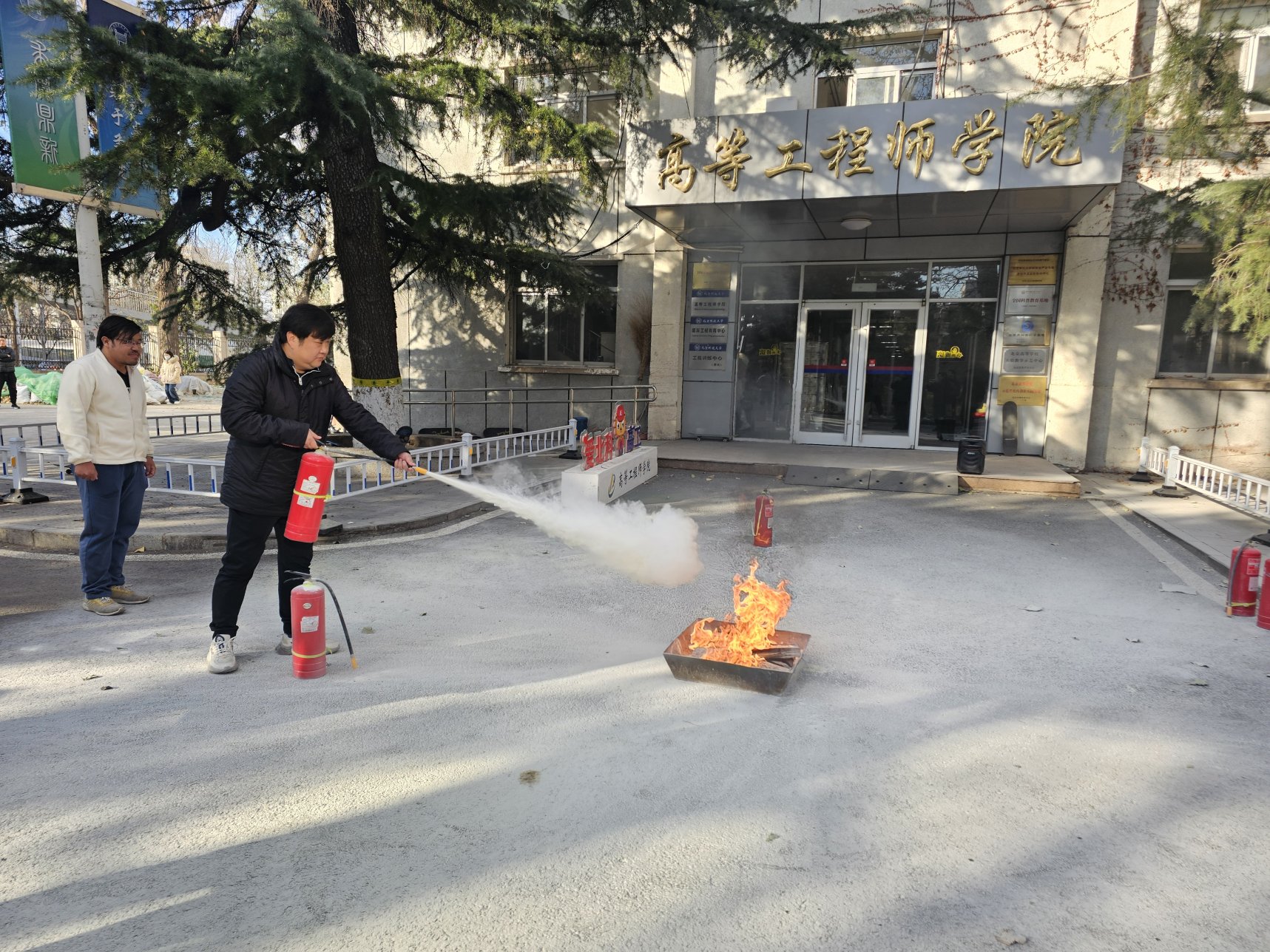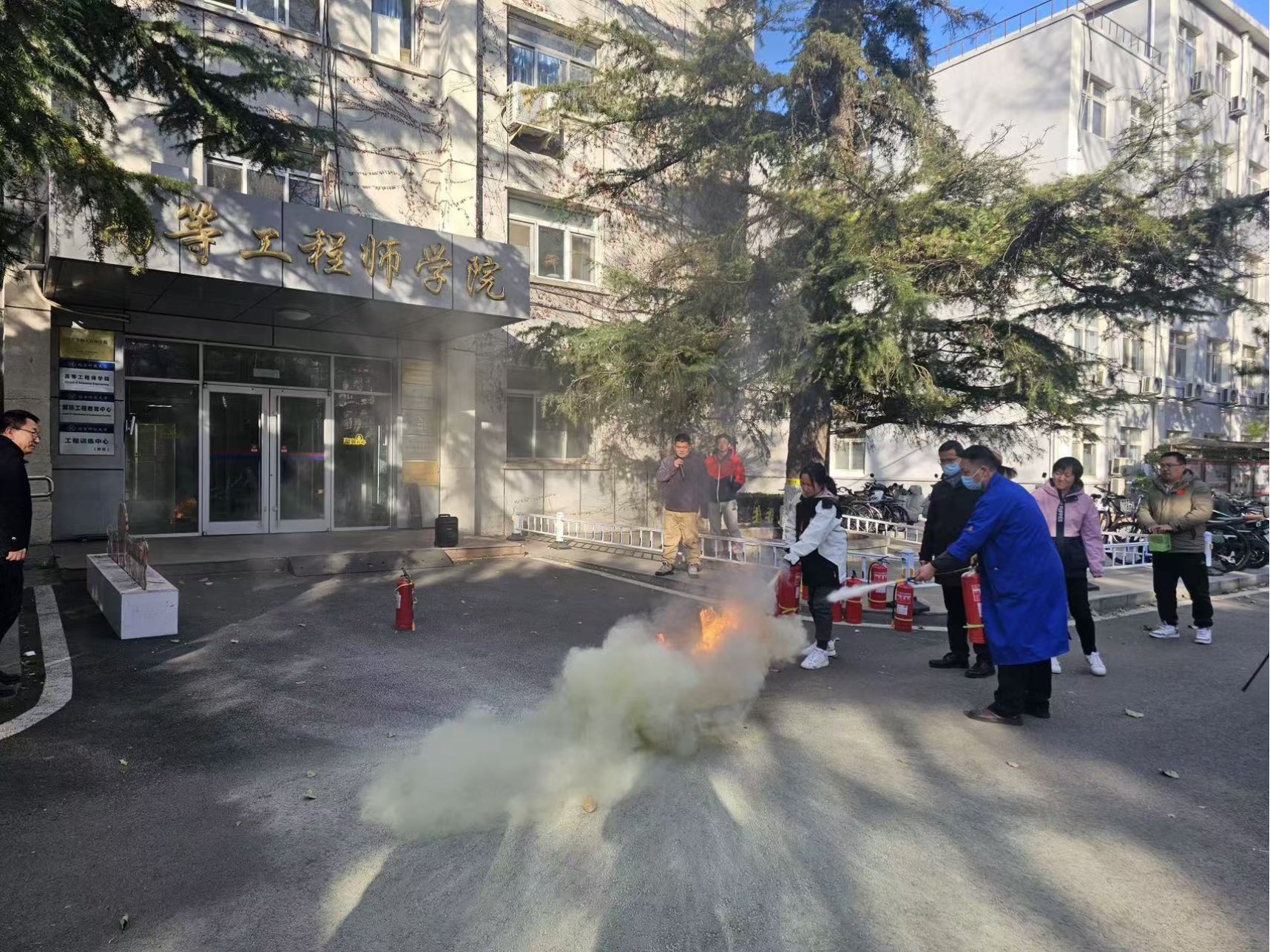 疏散到安全地带后,全体师生在学院楼前集合,保卫处专业人员详细讲解了消防逃生防毒面具的使用方法,以及干粉灭火器的正确操作步骤。理论知识讲解完毕,现场点燃了火盆,保卫处老师演示了如何快速、有效地使用干粉灭火器扑灭火源,使师生们对消防安全有了更直观的理解和掌握。