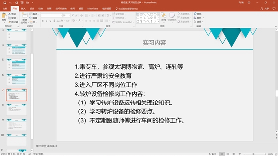 何奇洺介绍太钢的地理位置和历史渊源,并分享了自己在转炉设备检修岗工作的主要内容。他强调通过现场观察高炉、转炉、连轧的运行状况,对运行原理有了更深刻的把握;并可以强化观察能力和解决问题的能力,提升总体工程能力。